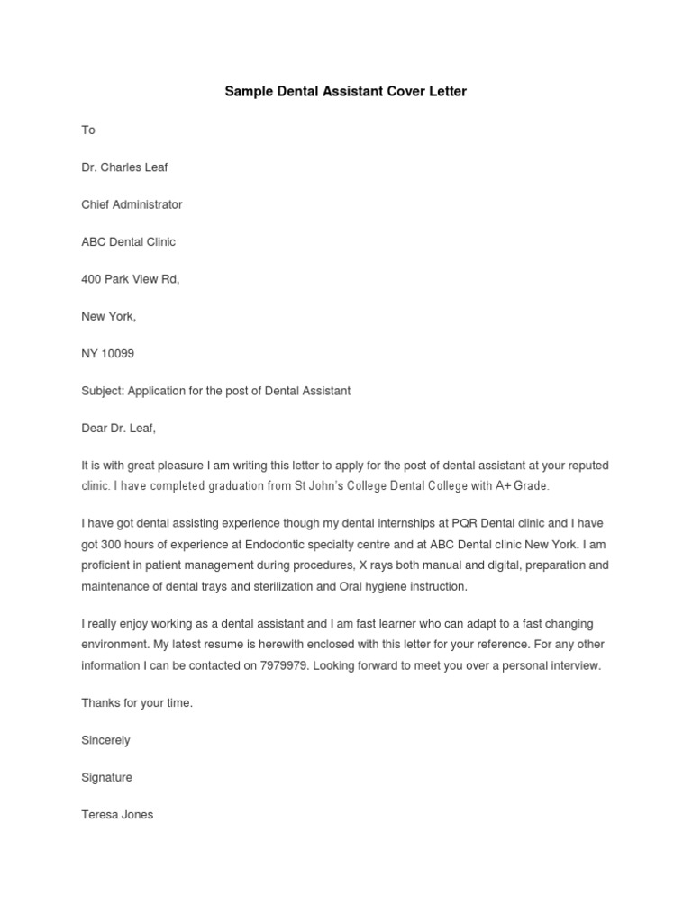 After all, you only have one opportunity. The letter should be concise to fit in one page only. Not every cover letter for resume dental assistant can make a proper impression and be remembered against other candidates. Dental assistant cover letter examples. Get started on your dental assistant cover letter, by using our example as a guide.